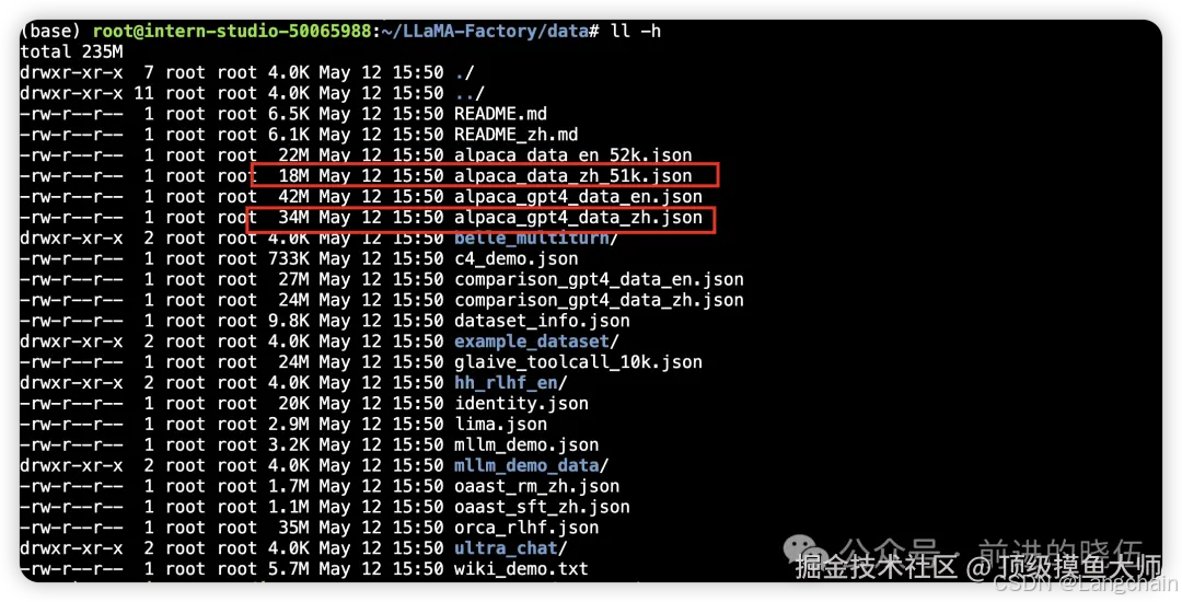 本教程我们选择LLaMA-Factory自带的数据集进行微调,位置在 /root/LLaMA-Factory/data/。
