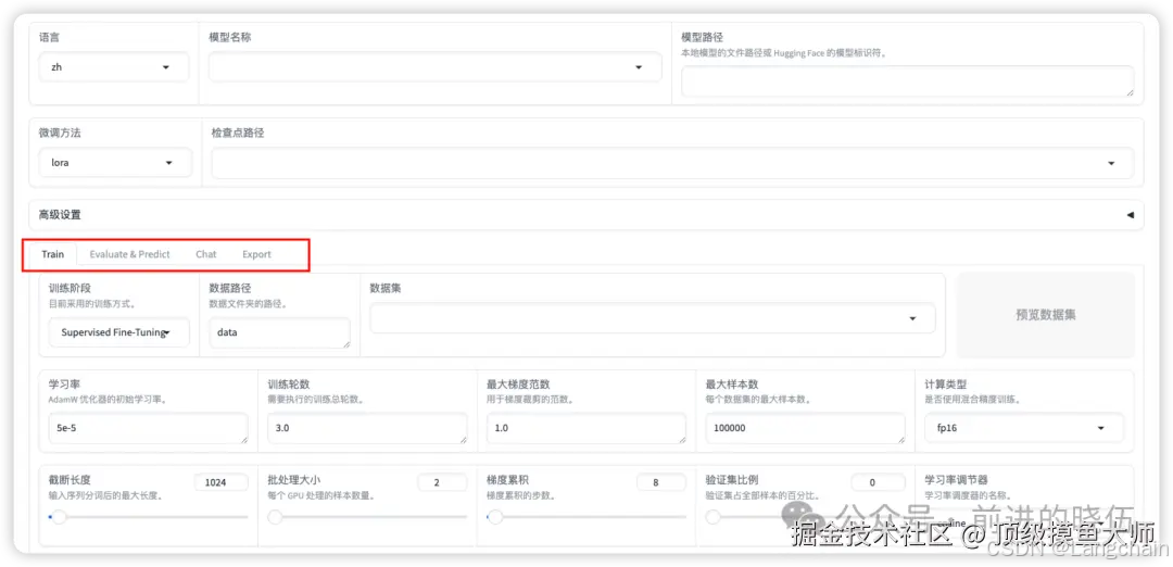 可以看到有Train(训练),Evaluate&Predict(评估和预测),Chat(对话),Export(导出)四个模块。