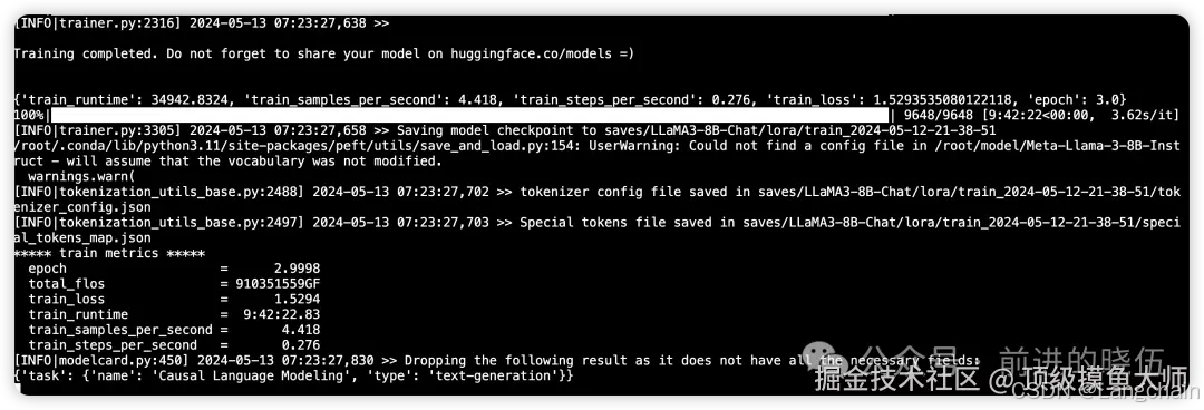 完成LoRA微调,花费了9.5小时: