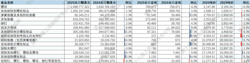 从最新出口分类数据来看,2025年中国紧固件产品结构正在持续向高附加值、专业化和应用场景导向方向演进。
