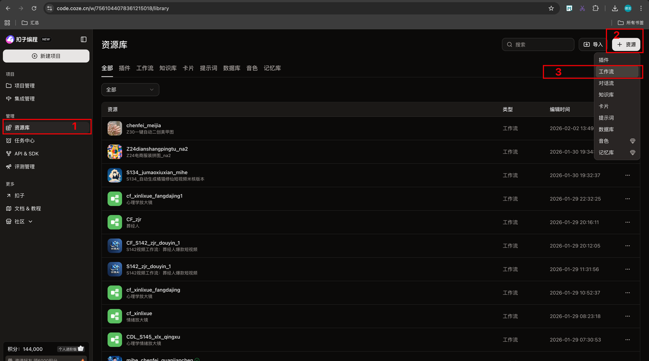 2、点击 “扣子编程->个人空间 ->资源库-> 资源->工作流”
