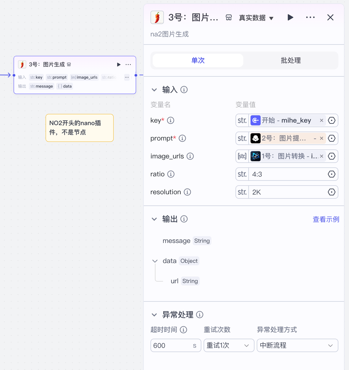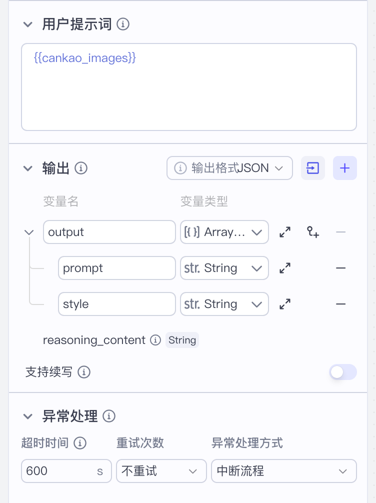 用户提示词,输出和异常处理的设置: