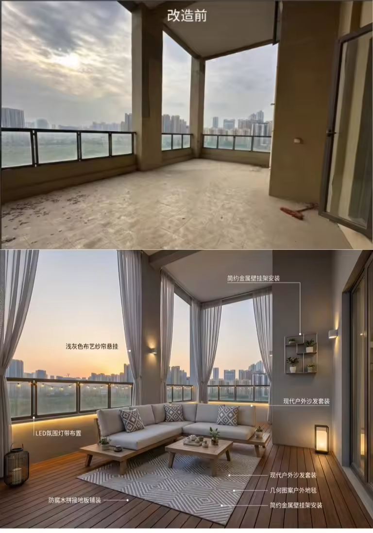 上方这张是我上传的原始阳台实拍图。而下面这张充满设计感的效果图,整个生成过程只用了大约1分钟——没错,只需要一键启动这个我搭建好的 Coze 工作流,它就能自动为你输出直观的改造预览。
