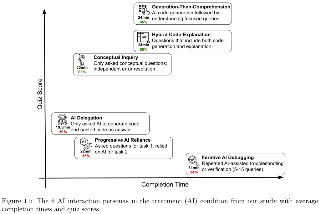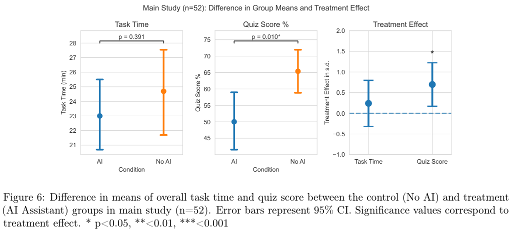 尽管我们普遍认为AI是效率的倍增器,但在这次需要学习新知识的任务中,AI组的平均完成时间为19.5分钟,而无AI组为23分钟。
