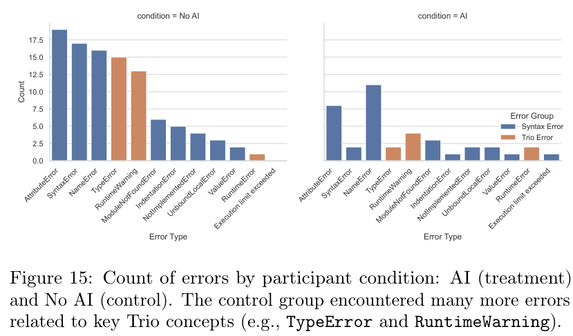 通过对比两组参与者的错误日志,发现了一个鲜明的反差:无AI组的参与者遭遇了大量的报错,而AI组则一路绿灯。