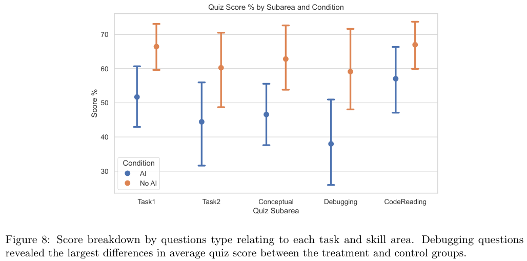 这种能力的流失并非均匀分布,数据显示,AI组在调试(Debugging)类问题上的丢分最为严重。