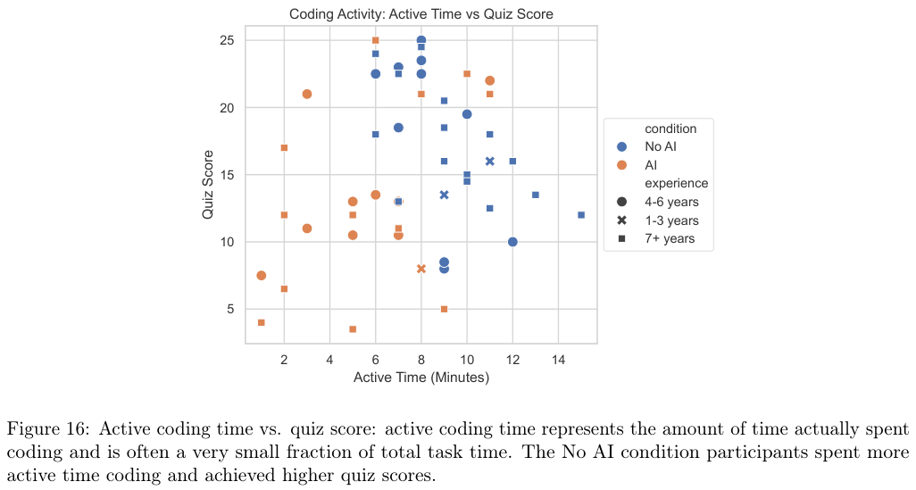 而AI组的活跃编程时间大幅减少,他们的大部分时间变成了被动的阅读者和等待者。