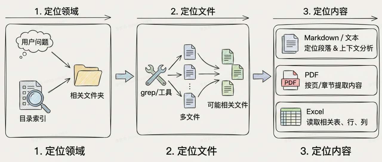 定位领域:通过分析用户的问题,然后结合知识库的目录索引定位出知识可能存在的领域(文件夹)。定位文件:使用 grep 这样的方式在指定目录、文件里筛选出「可能相关的文件」,然后再按需用不同工具去读取这些文件的关键部分。定位内容:针对不同文件类型用不同策略:Markdown / 文本:直接定位到匹配段落,结合上下文分析PDF:编写代码调用专门的 PDF 能力按页、按章节提取内容Excel:编写代码读取