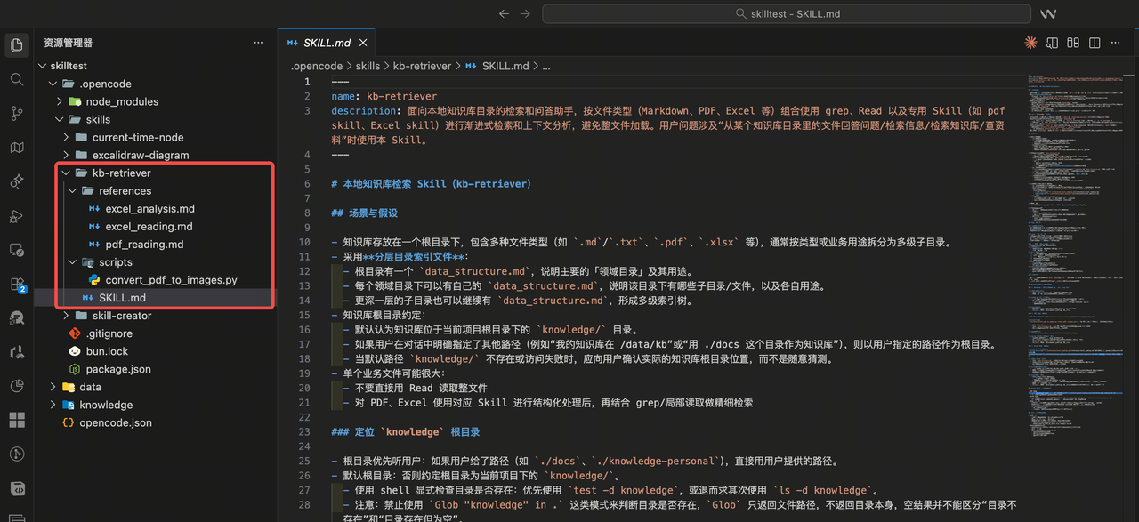 - references:放置 PDF、Excel 等特殊文件类型的解析方法,只有确定当前知识需要具体分析一个 PDF、Excel 或其他特殊的文件类型时,再查阅详细的处理文档,可以节省 Token 和注意力。
