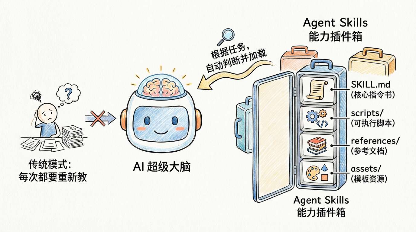 Skills 是最近 Anthropic 推出的一个 Agent 领域的行业标准,它本身就是一个文件夹,里面存放着具体的使用说明(SKILL.md),更详细的参考文档(reference),以及可执行脚本(script)。