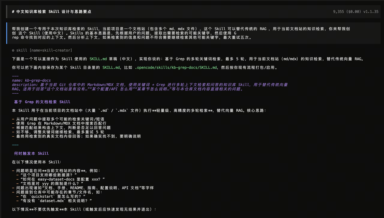 - 保持简单可控:用户只需要告诉它知识库在什么位置,其余的检索策略都由 skill 自动完成。