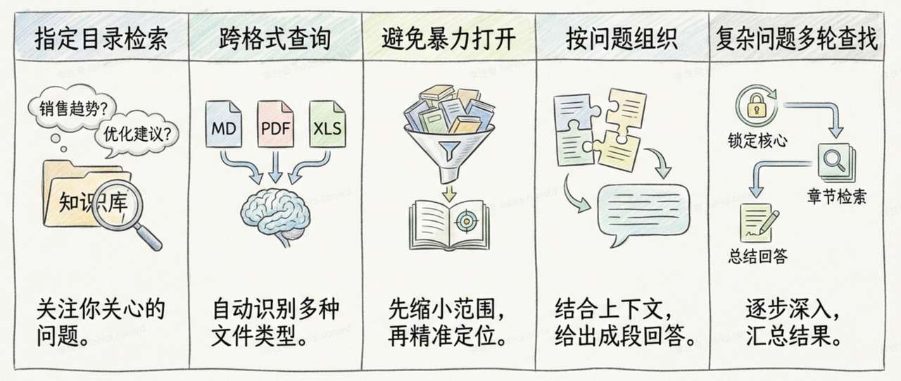 - 避免「暴力打开整库」:不能一上来就把所有文件全部读进来,而是像人一样:先按关键词缩小范围,再精准打开少量相关文件,快速定位答案。