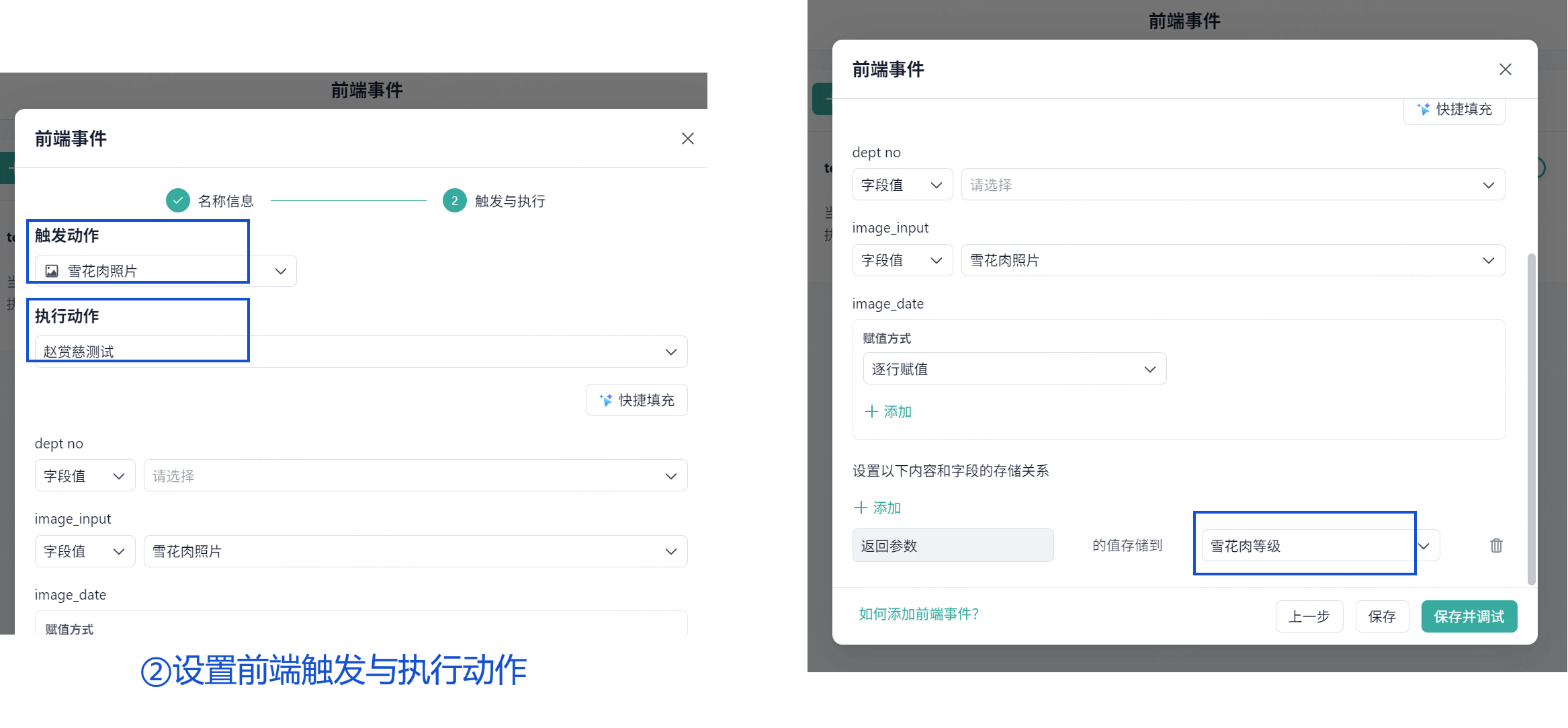 输出映射:插件返回的classification_name参数→表单“雪花肉等级”字段。