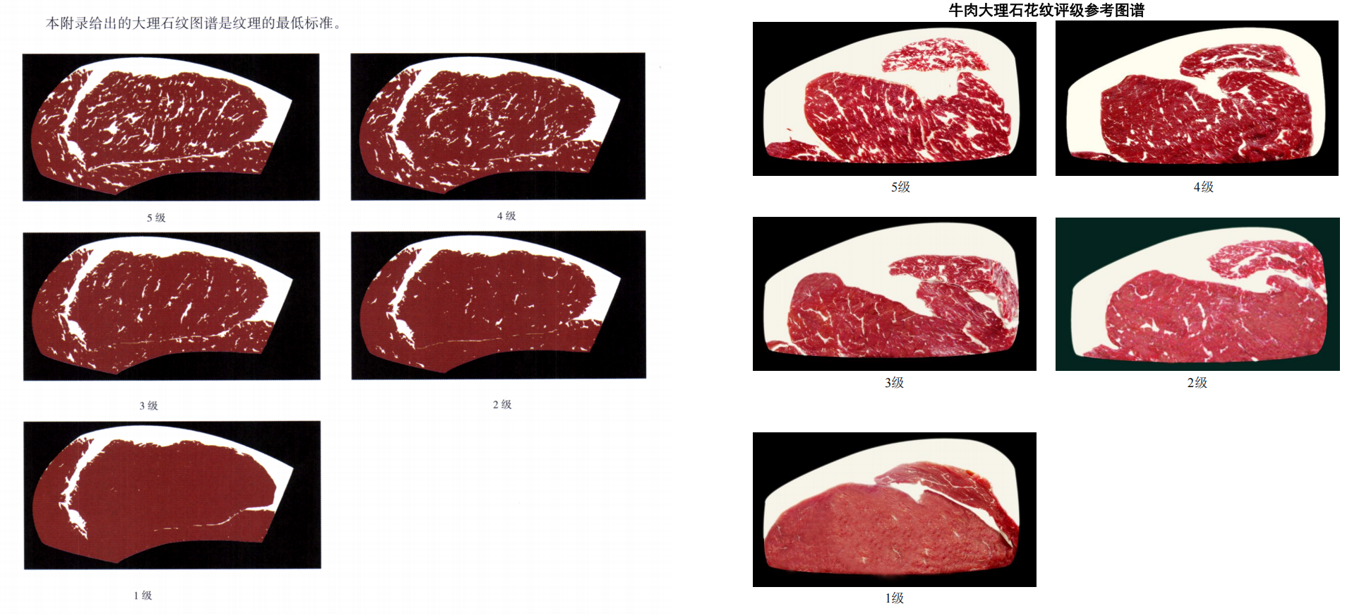当前国内牛肉大理石纹(雪花肉)的定级依赖国家规范中的参考图谱(如图所示,分为1-5级),但人工判定存在显著痛点: