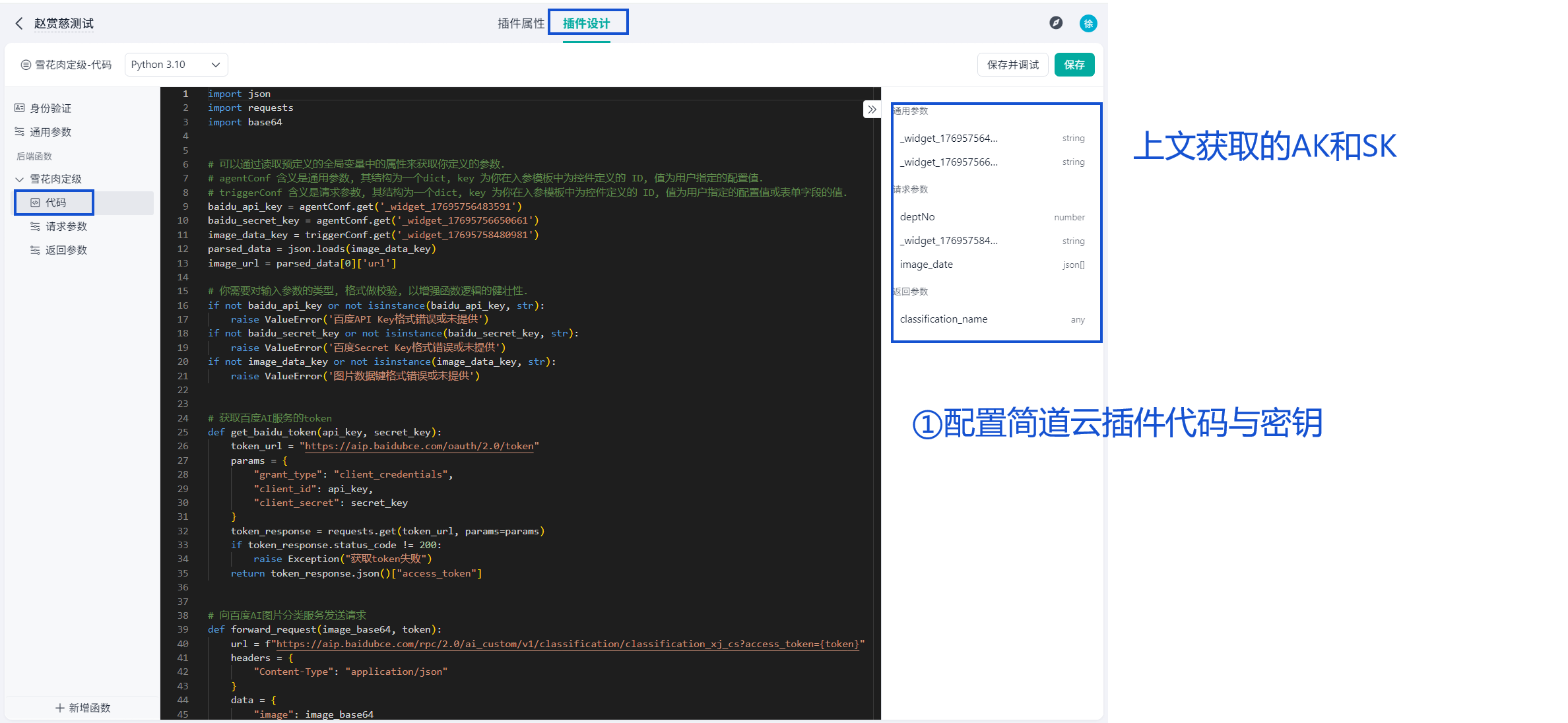 插件通过Python代码实现与EasyDL模型接口的交互,核心逻辑是串联“参数校验→令牌获取→图片处理→接口调用→结果解析”,确保数据处理与接口调用的稳定性: