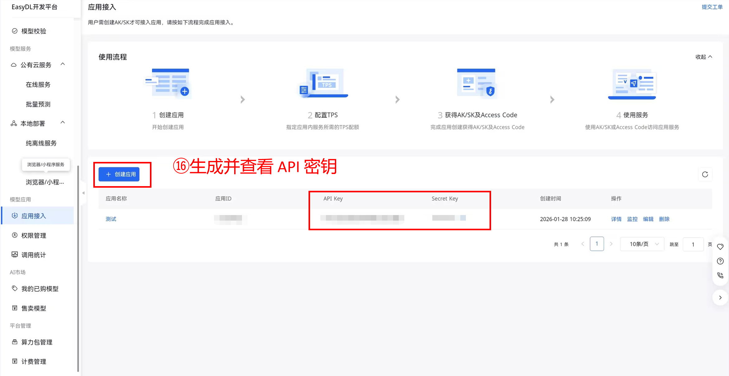 应用接入配置:在“模型应用”模块创建专属应用,完成应用信息登记后,获取应用对应的API Key(AK)和Secret Key(SK)(后续简道云插件需通过这两个密钥完成接口调用的身份认证);