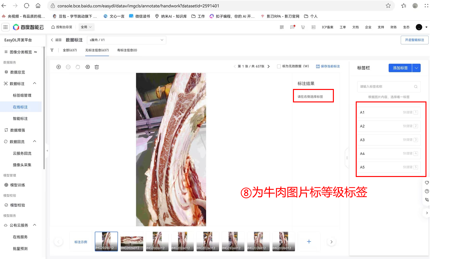 第一阶段:百度智能云EasyDL模型训练(核心技术支撑)—— 以国家定级图谱为标准,训练能精准识别雪花肉等级的图像分类模型,最终部署为可调用的API接口,为后续识别提供技术能力;