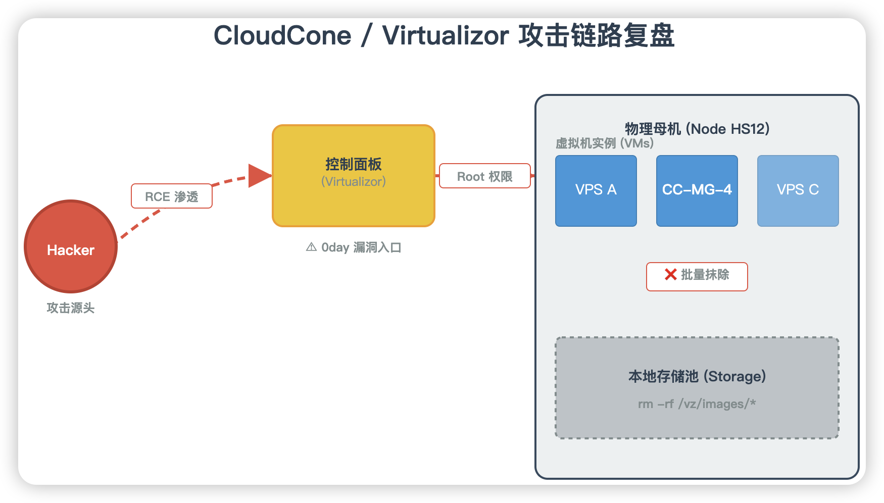 角色 C:Attacker (攻击者) 这次的黑客利用了 Virtualizor 的 0day 漏洞(通常是未授权的 RCE),绕过了身份验证,直接以管理员身份向母机下达了指令。