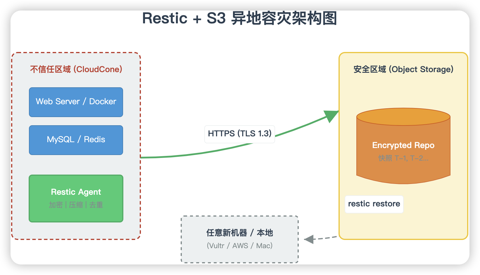 这就是我们优化后的架构,即使 CloudCone 的节点被核弹夷平,你的数据依然在云端(S3)安然无恙,随时可以拉起到任何其他服务商(如 AWS, Vultr, DigitalOcean)。