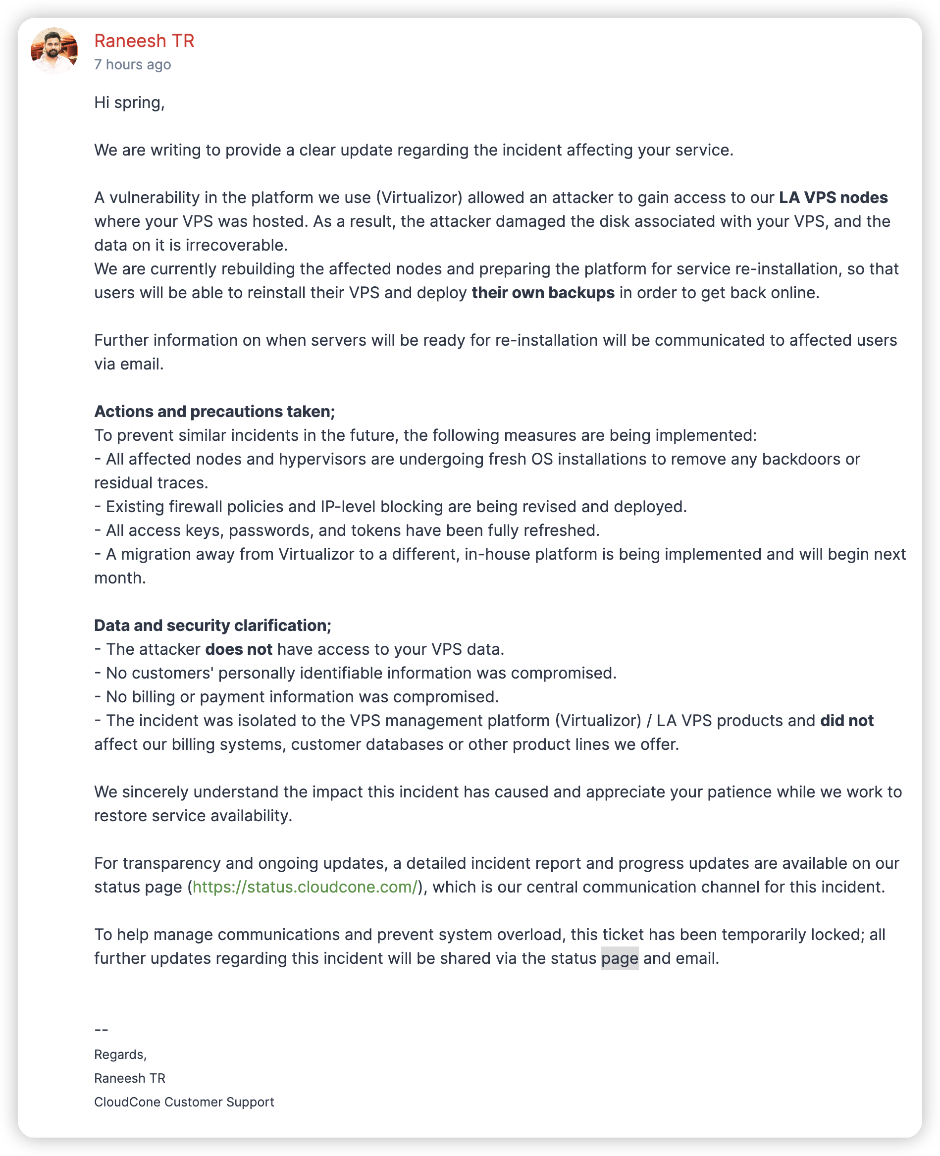 官方的解释令人窒息:“Virtualizor 平台的漏洞允许攻击者破坏了磁盘,数据全没了。”