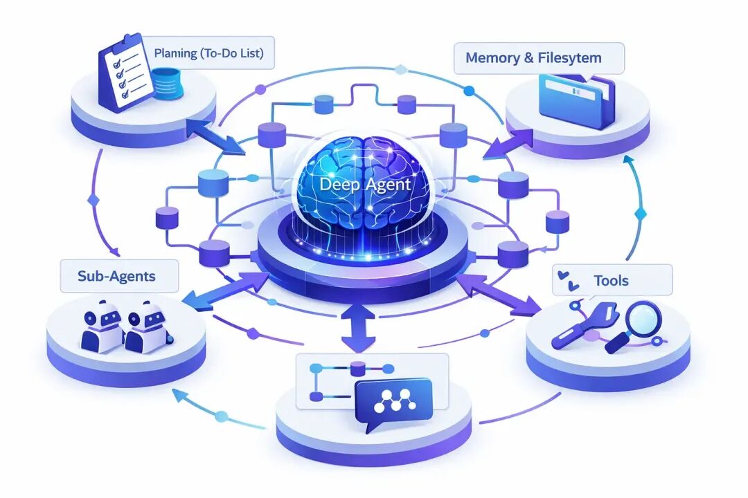 人工智能智能体(AI Agents)——即结合大型语言模型(LLMs)与外部工具以执行任务的程序——已从学术概念演变为生产应用的核心组件。然而,简单的智能体往往难以应对需要规划、上下文管理与子任务协调的复杂多步骤任务。为此,深度智能体(Deep Agents) 应运而生,这类智能体具备长期推理能力,能够将复杂任务分解为更小的部分,管理记忆,并在必要时调用专门的子智能体。