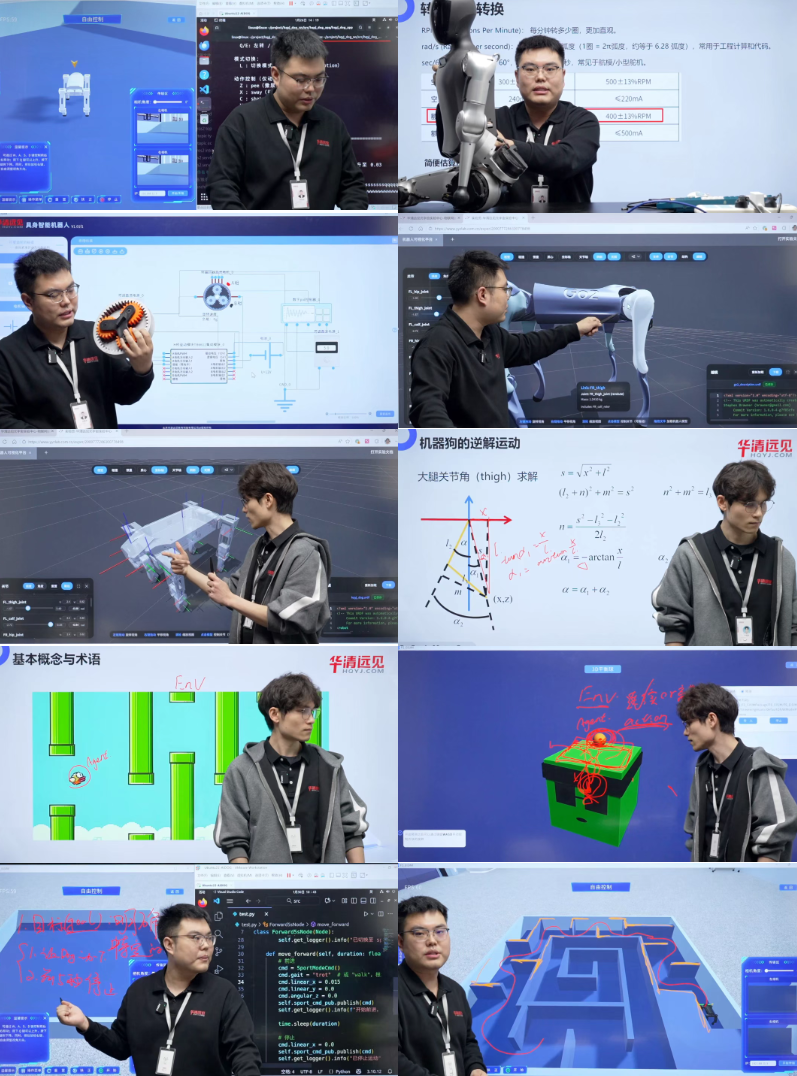 整个课程采用 “大屏真人理论讲解 + 虚拟仿真实操演练” 的双平台模式:理论部分由资深讲师拆解复杂技术原理,结合企业级项目案例将抽象的运动学建模、强化学习算法等具象化;实操环节全程依托华清远见自主研发的具身机器人机器人虚拟仿真系统,无需依赖实体硬件即可完成全流程操作,每个技术模块均配套专属仿真实验,通过 “边学边练、即学即练” 巩固核心知识点。同时讲师同步分享课程体系设计思路与教学资源,助力教师快速将所学技术与实操经验转化为适配高校教学的课程方案。