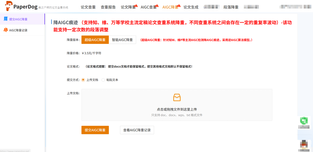 核心功能:它可以根据不同的检测标准来精准降低AIGC特征,同时支持中英文论文的优化。