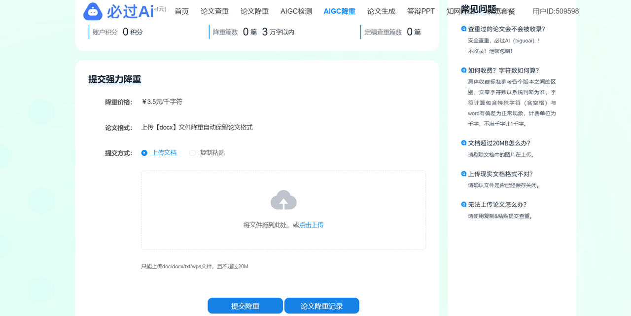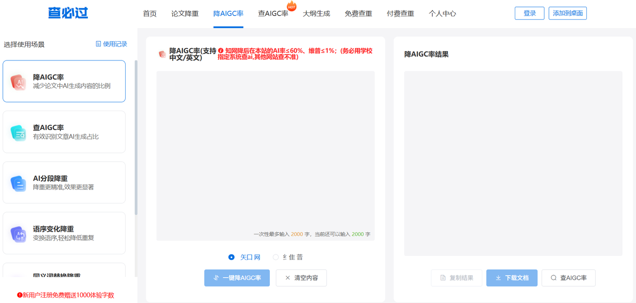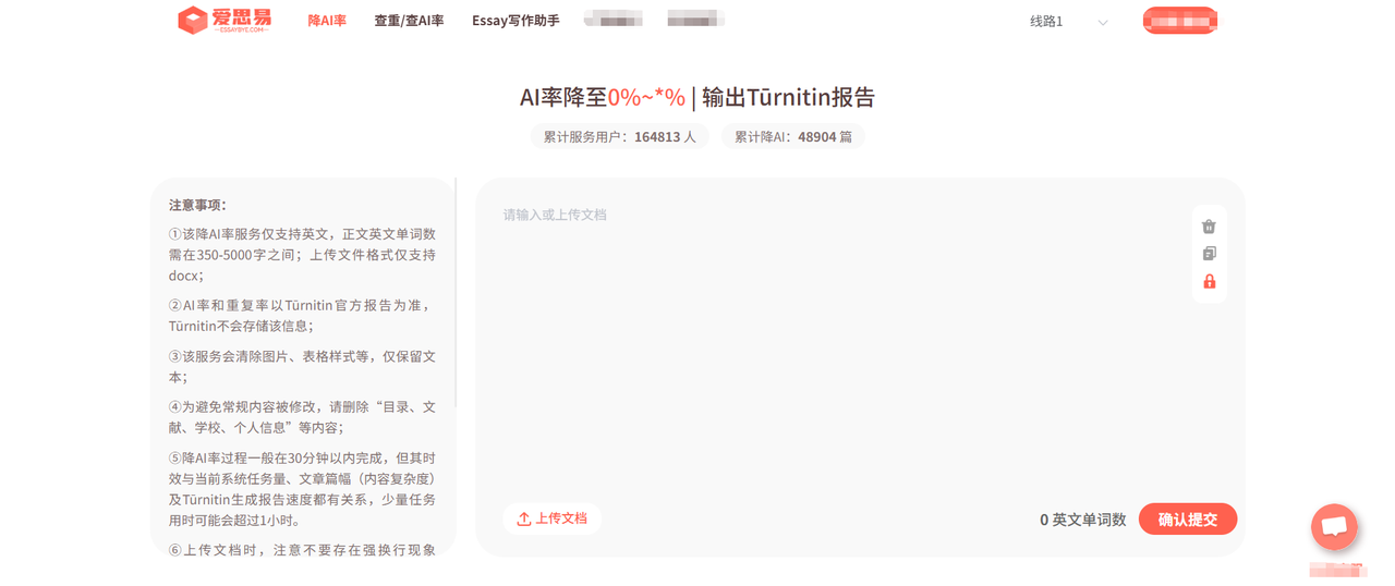 注意事项:新用户有1000字的免费降ai率额度,7天内支持无限次修改。