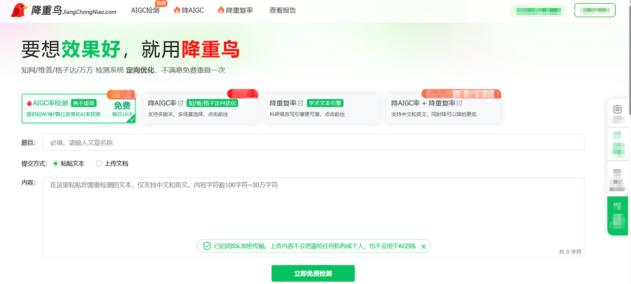 注意事项:它每天有10次免费降ai率检测,就算不买AIGC降重服务,拿来当个免费检测工具用也是不错的。