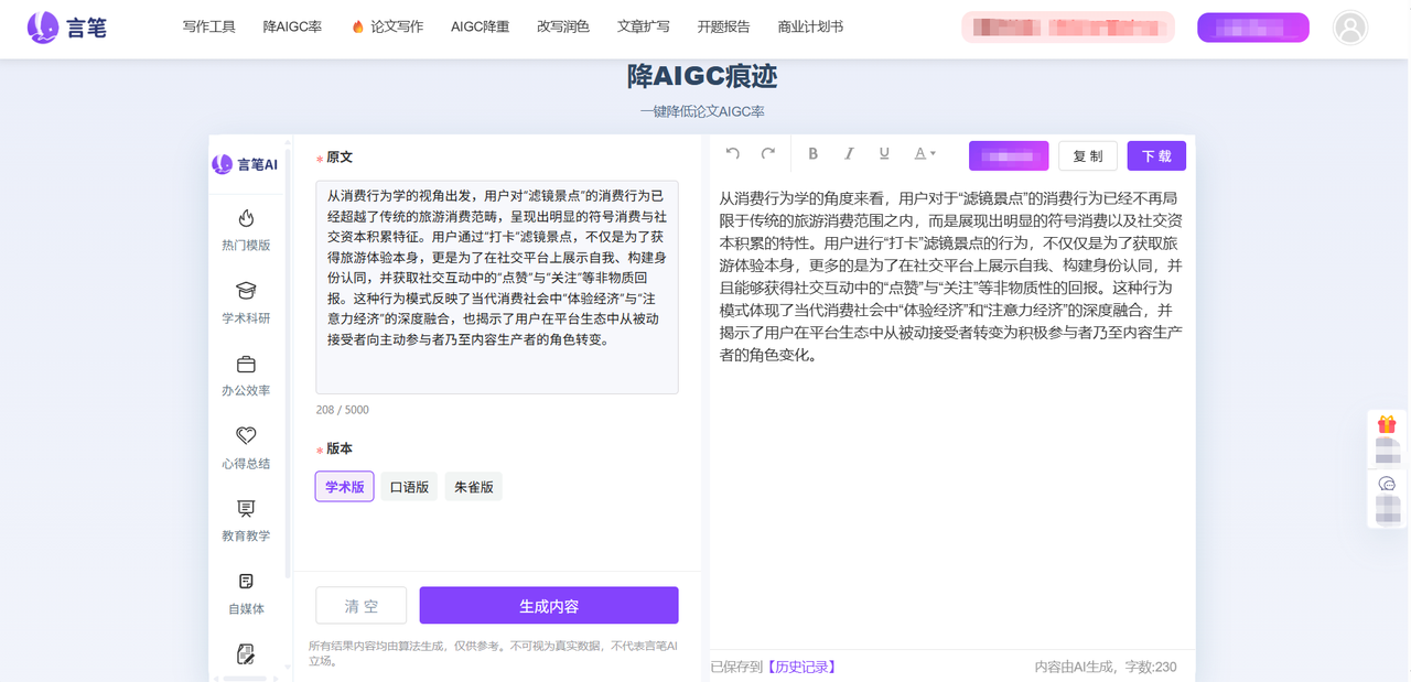 使用体验:最大的优势是便宜,3.5元/千字,而且AIGC检测每天免费两篇。我拿它试过水,作为入门级的降低ai率工具还可以,但别指望它能处理特别复杂的学术逻辑。