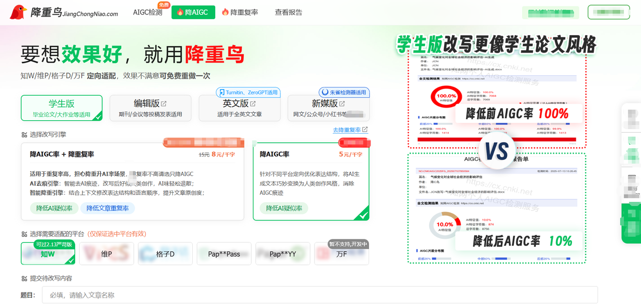 核心功能:针对知网、维普、万方这些不同平台做了定向适配,优化表达结构,将AI文本转换成人类创作风格。