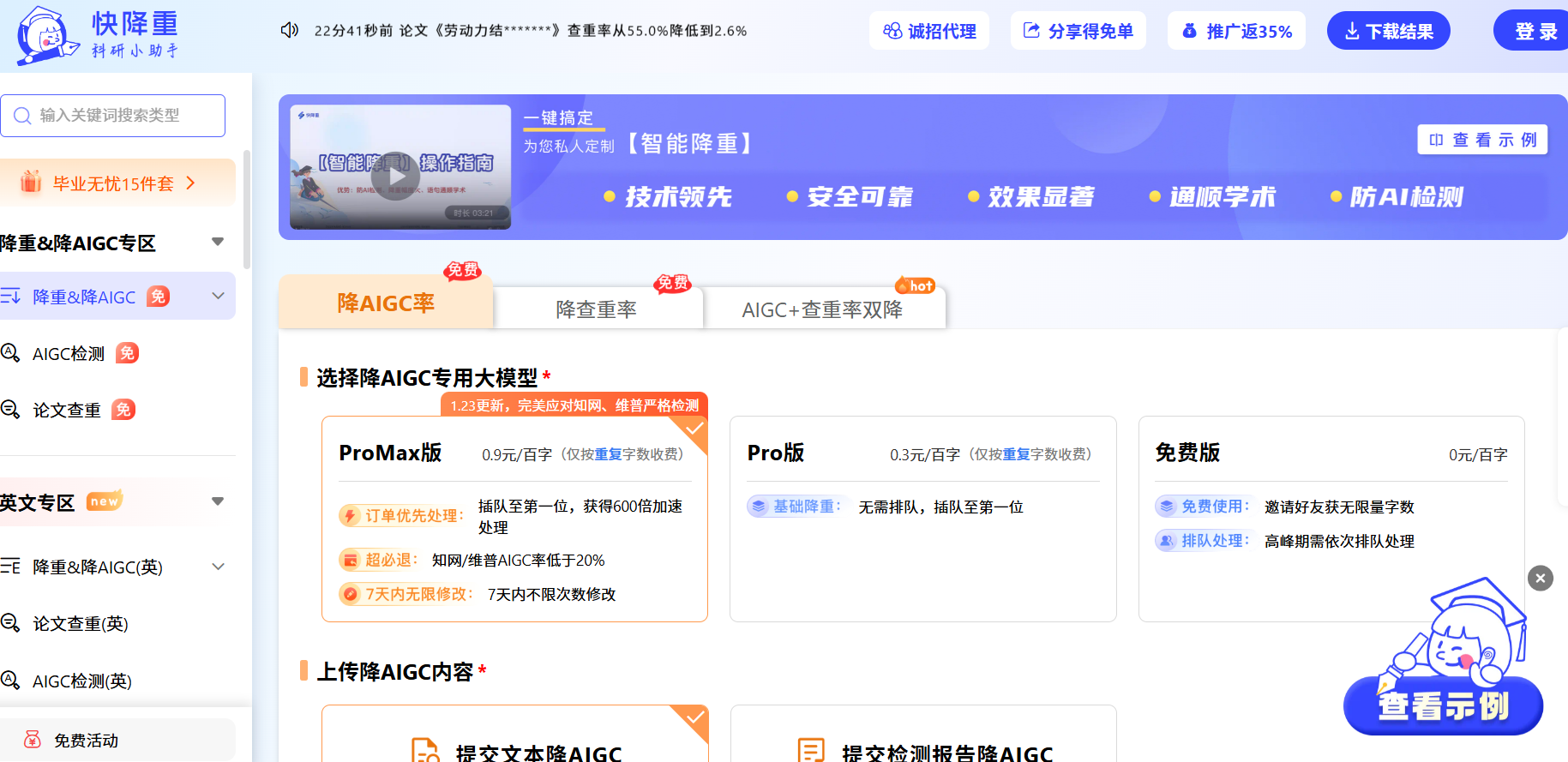 总而言之,AIGC降重是一把锋利的双刃剑。它能够显著提升写作效率,但驾驭它的,必须是作者的学术判断力与责任心。扎实的研究、清晰的思考和规范的引用,始终是学术论文的基石,而如快降重这样的智能工具,旨在为您扫清表达上的障碍,让您更专注于创新本身。