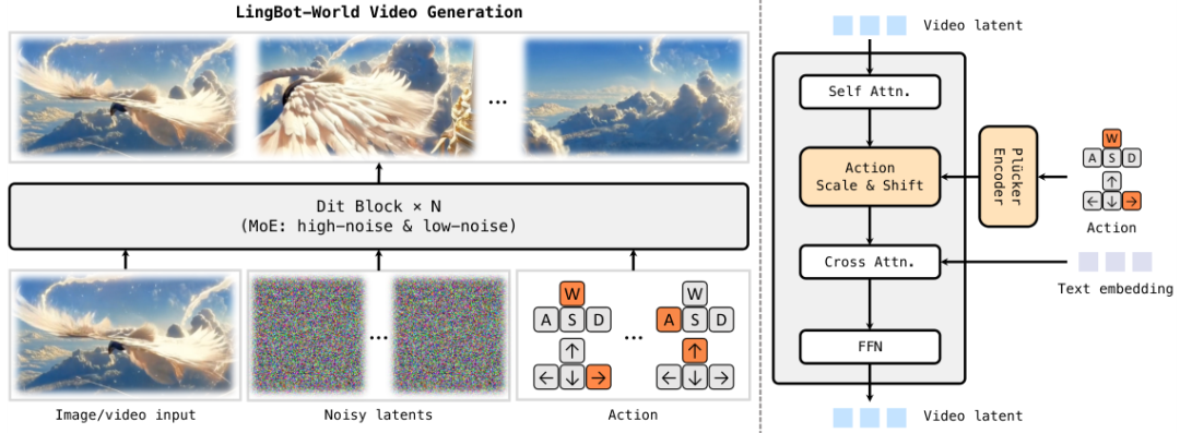 LingBot-World采用了拥有140亿参数的Wan2.2图像到视频扩散模型作为基础。