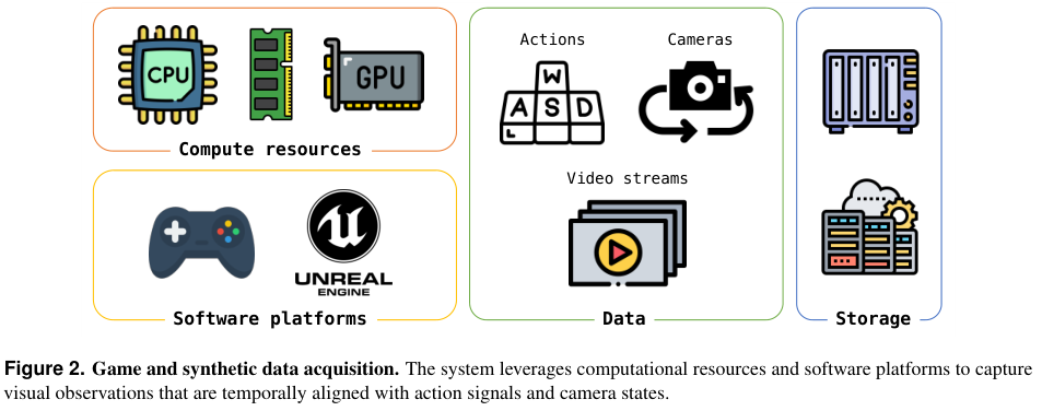 同时,专门采集了严格配对RGB帧与用户控制输入(如W、A、S、D按键)及相机参数的游戏数据。