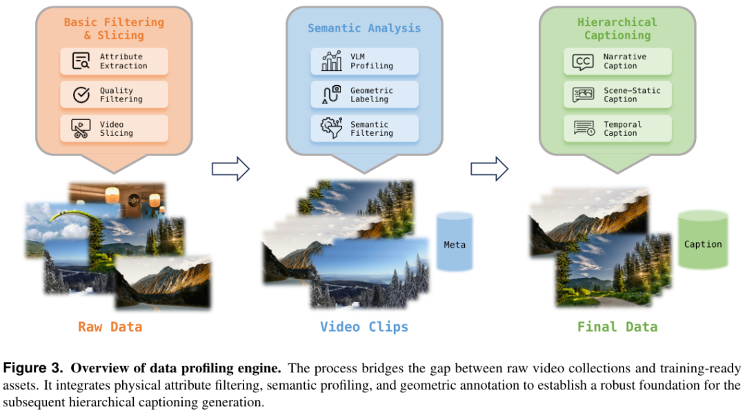 确保了每一个用于训练的视频片段有高质量的视觉信息,还附带了丰富的结构化文本条件和几何先验,为模型理解物理世界的运作方式打下了坚实基础。