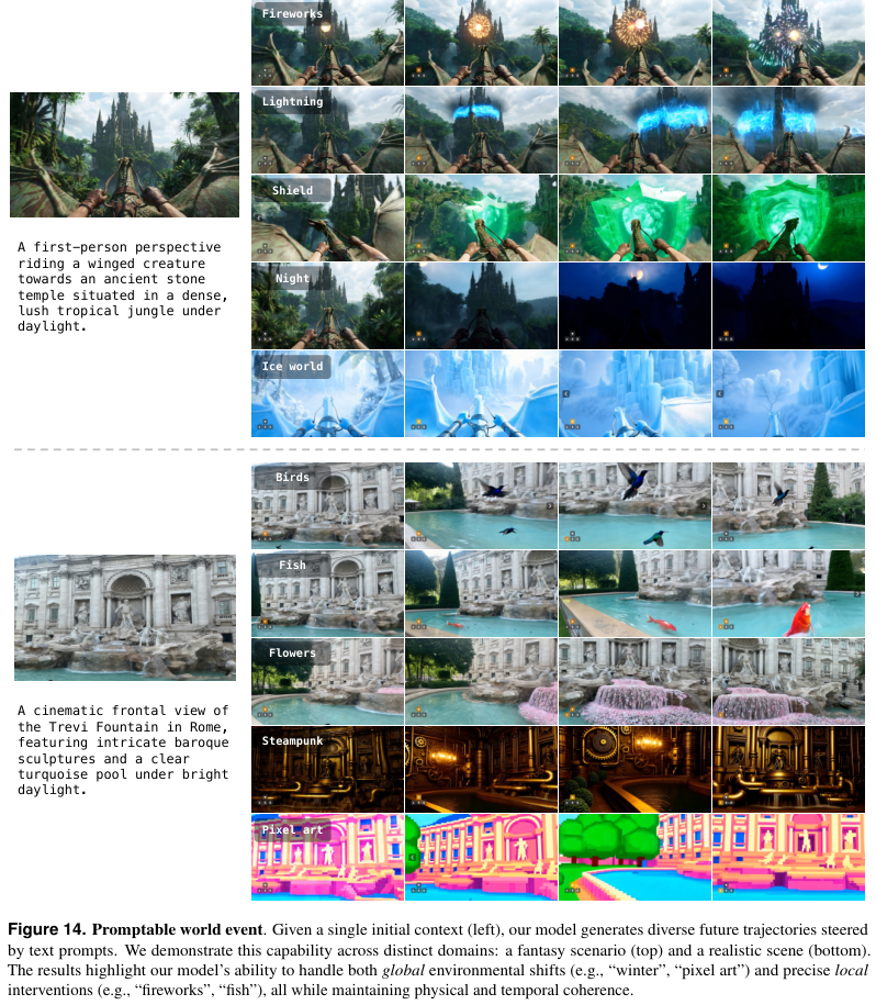 用户甚至可以无中生有,在城堡上空召唤烟花,或在喷泉中生成游动的鱼,模型能确保这些新增元素与环境物理交互的合理性。