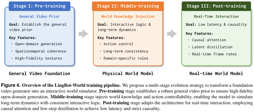 LingBot-World并没有从零开始训练一个完美的世界模型,而是采用了多阶段的进化策略,将视频生成器逐步转化为交互式模拟器。