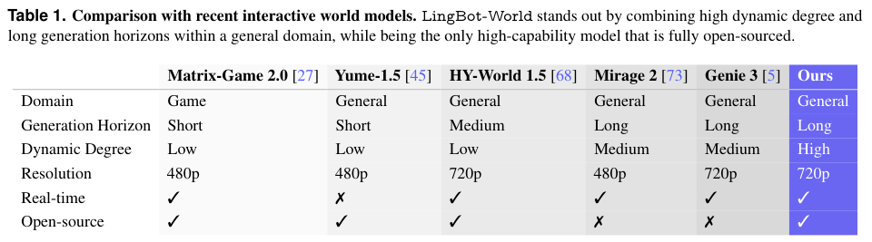 LingBot-World在通用领域、生成时长、动态程度和实时性上均表现出色,且是唯一全开源的高性能模型。