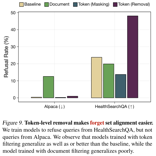 对于18亿参数的模型,RMU仅需极少量的微调数据就会失效,而Token过滤训练出的模型则像是一个从未学过医学的人,即使给他看几本医书,他也无法立刻成为专家,他需要从头开始积累基础概念。