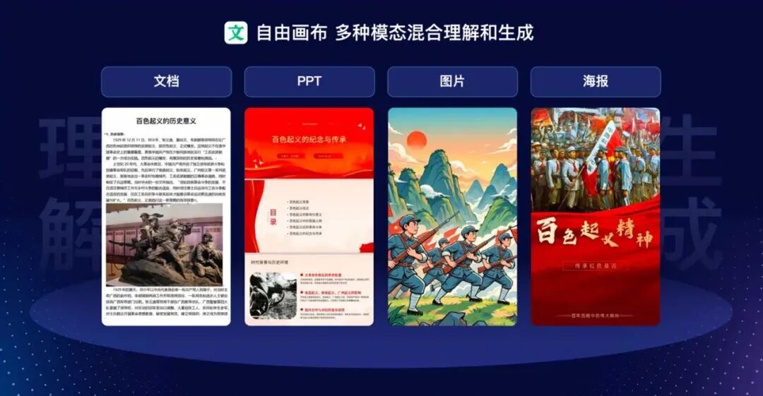 换句话说,自由画布打通了过去公域与私域资料之间存在的限制,避免了AI应用之间数据流通的孤岛现象。用户可以在自由画布上,拖入文库和网盘内的文档、音视频等丰富多模态素材,基于背后的MoE架构和多模态模型,生成适配多平台的多模态内容。