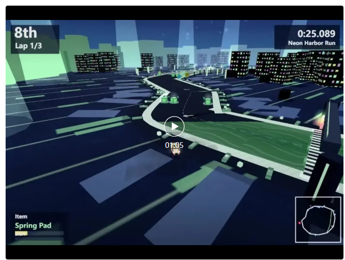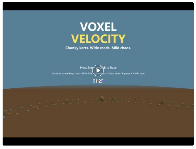 使用Three.js实现Voxel Velocity作为一个3D体素卡丁车赛车游戏,只有一种模式:单人比赛(总是3圈,1个人类对7个CPU,所有8条赛道立即在这个模式下可用,没有进度限制)。构建一个最小的赛前流程,仅包括:赛道(8),角色(8),难度(轻松/标准/刻薄),可选的镜像模式,可选的允许克隆,和开始比赛,加上一个选项菜单和一个赛中暂停菜单(恢复/重新开始/退出)。创建一个街机驾驶模型,具有灵敏的操控,宽容的擦墙碰撞,有意义的漂移作为主要技能,以及一个漂移充电系统,产生精确的加速等级(1级0.7秒,2级1.1秒,3级1.5秒),同时保持基准速度「快但可读」,并且在宽阔的道路上保持持续的超车。实现正好8个道具,单道具容量,微妙的位置加权分布,和温和的效果(最大失控≤1.2秒,最大转向禁用≤0.6秒),创造滑稽的混乱而没有硬眩晕,加上在加速期间减少50%的越野减速。定义8个角色及其给定的统计数据和AI倾向,实现CPU难度预设和赛道编写的赛车/变化样条线,漂移区和危险回避,以便AI使用多车道宽度进行干净的超车,并发布HUD/音频要素(位置,圈数/最后一圈横幅,小地图,道具槽,计时器/分段,可读的音效,和每个赛道一个音乐循环)。
