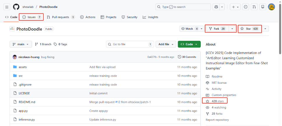 - 完整信息性:优先选择开源项目,尤其是原作者主动公开代码仓库、数据集,这种项目复现难度较低。同时,选择项目时优先关注项目活跃度、检查 Star 数、Fork 数、更新频率、issue 解决率等。一般情况下数值越高,说明社区认可度高、维护更及时,遇到问题更容易找到解决方案;
