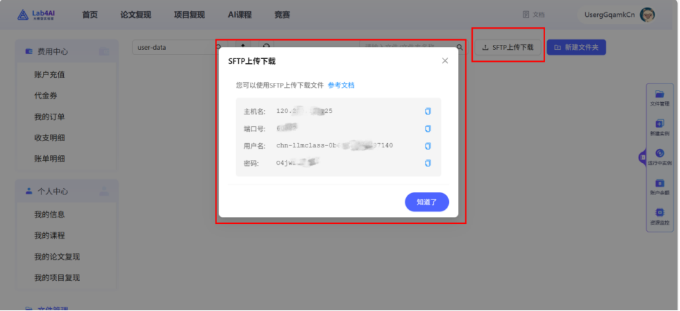 - 2、进入大模型实验室(Lab4AI)的“文件管理”页面,点击“SFTP 上传下载”,弹出提示弹窗,显示主机名、端口号、账号和密码。将这些信息复制粘贴到 Syberduck。