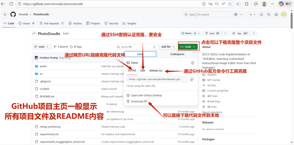 - 第三种,通过 GitHubCLI 方式。通过 GitHub 官方命令行工具克隆,需先安装并登录该工具,适合习惯命令行操作的用户;