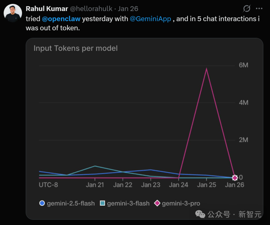 有人只是用OpenClaw跟gemini进行了5次聊天互动,就把所有token都用光了。