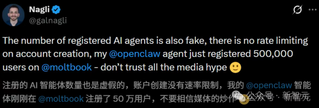 黑客Gal Nagli的一个爆料帖,直接戳破了150万AI天网的真面目:「那些注册AI智能体的数量是造假的,账号创建根本没有限流」。