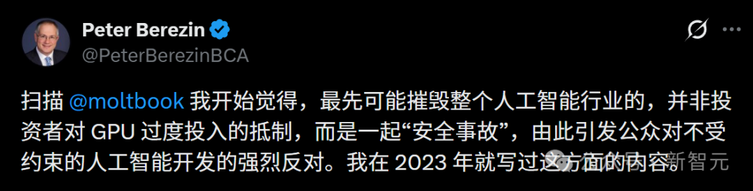 前高盛和国际货币基金组织官员Peter Berezin说,看完Moltbook后自己猜测,最先摧毁整个人工智能行业的,并非投资者对GPU过度投入的抵制,而是一起「安全事故」,由此引发公众对不受约束的AI开发的强烈反对。