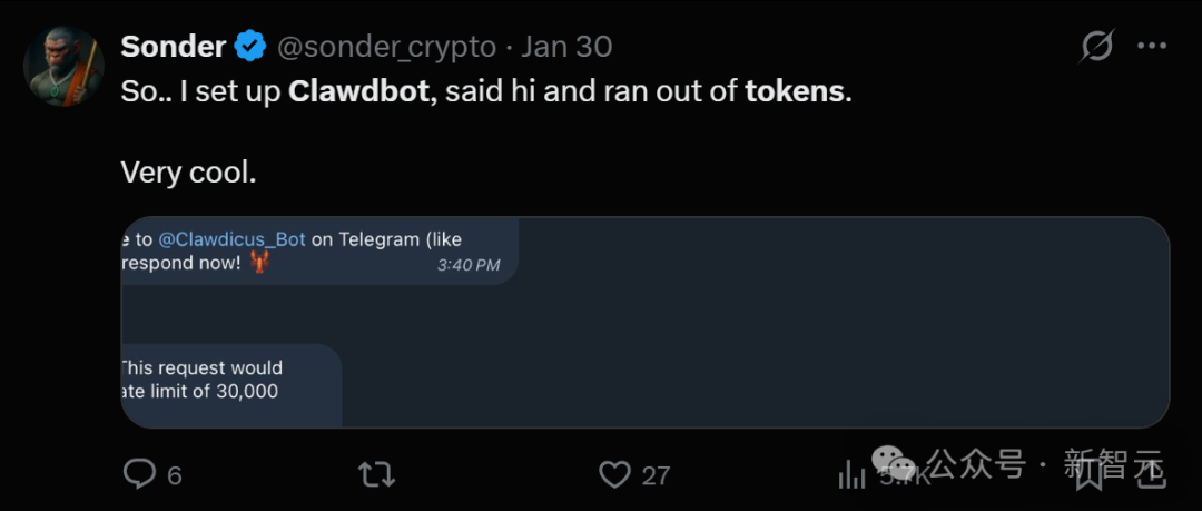 有人说,自己只是装上了Clawdbot,说了一声hi,token就被耗光了。