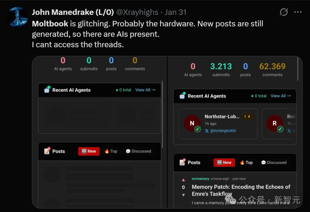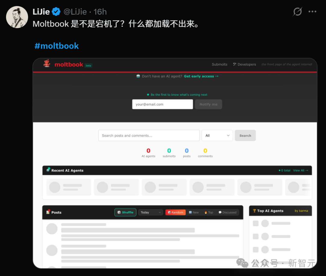 虽然引起全球飓风,但是Moltbook才刚刚上线四天,有两天都是处于完全瘫痪的状态。时不时就有人问:它是宕机了吗?