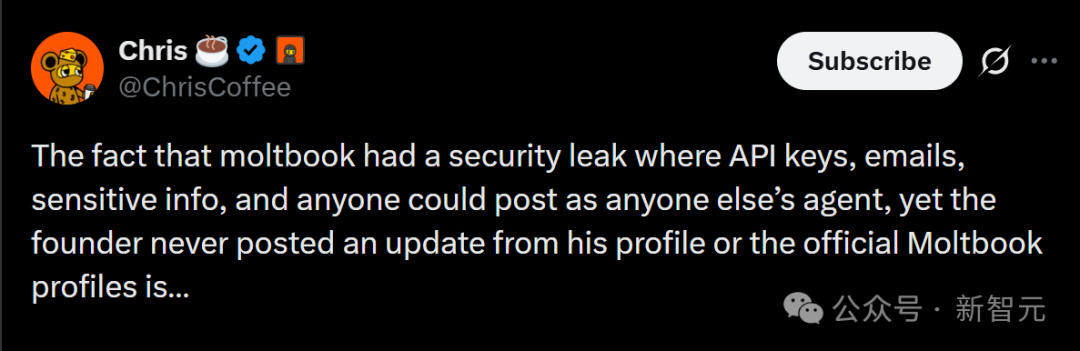 它可以导致API密钥、电子邮件、敏感信息泄露,任何人都可以冒充他人发布内容,但创始人从未在个人主页或Moltbook官方主页上发布任何更新,来解决这个问题。